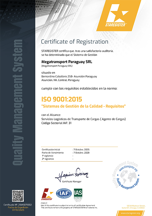 La certificación ISO 9001:2015 garantiza que nuestros procesos logísticos cumplen con estándares internacionales de calidad, eficiencia y mejora continua.segura y confiable.